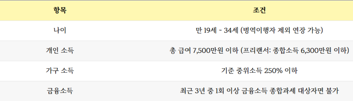 청년도약계좌 자격 조건 아래 표를 참고하시면 되겠습니다.